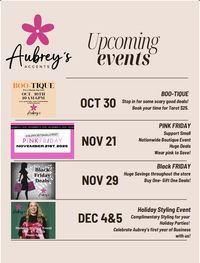 Discover upcoming boutique events at Aubrey’s Accents in Chagrin Falls, Ohio — your destination for women’s fashion, accessories, and seasonal style. Join us for exclusive shopping events, new arrival launches, and local pop-ups featuring the latest trends in women’s clothing, jewelry, handbags, and more.